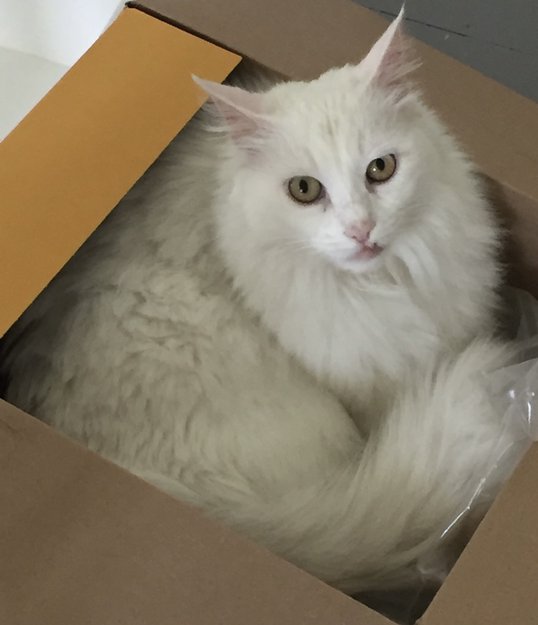 Katten er helt hvit grønne øyne. Hvis di ser nøye etter munnen så ser du en tann. Den er ikke inne i munnen men den er utenfor, for når hun var liten så lekte hun og datflyttet tannen på seg og da ble det sånn