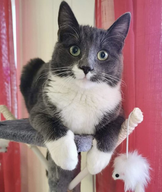 Grå, hvit hunkatt 1 år gammel. ID-merket og sterilisert. Hadde rosa halsbånd med sløyfe da ho forsvant. (I chip-informasjon står det hannkatt, men det er en hun 😊)