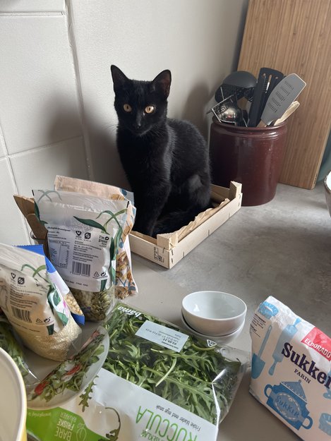 Svart korthåret blank pels. Lang og slank, liten og lett. Store trillende runde brungule øyne. Nylig sterilisert, barbert under magen. Kan være blandet med siameser? Kanskje et halvt år.