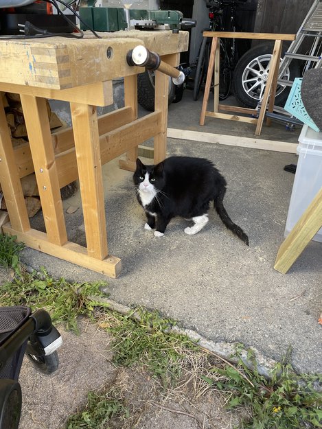 En svart og hvit katt oppholder seg i garasjen vår. Tror kanskje den er gravid eller akkurat vært gravid