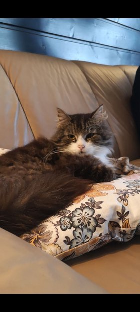 Han er ikke en veldig stor katt, men har lang pels og bustehale. Han har hvite poter og er hvit fra nesen og nedover halsen og på magen. Han har 6 klør på hver pote, så potene hans ser store ut i forhold til resten av kroppen. Jeg tror han kan være imøtekommende mot andre mennesker, da han er kosete, men det er uvisst.