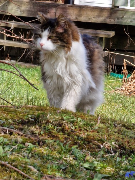3 Color. Den er hvit på mage, poter og front. Det er som en stor hvit stripe på hans venstre side. Bakdelen er mørk. Han er litt pratsom, kontaktskapende. Jeg tror han er godt voksen.