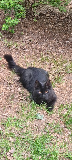 Det finnes en fin liten svar katt med myk hår, gule øyner og bustete hale som dukker opp i bakgården vår og foran The Italian Job pizza.