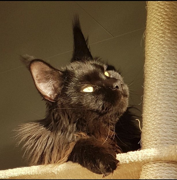 Veldig stor kastrert Maine Coon hann med gaupeører og buskete hale. Brunsvart, litt solbleket pels.
