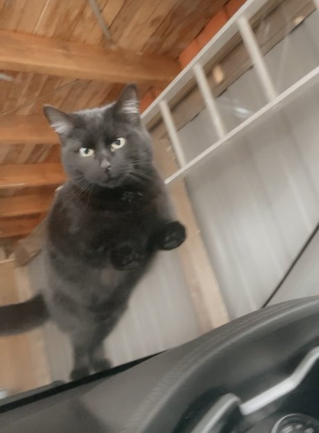 Sort, gule øyne. Han har noen hvite hårstrå under og i ører.