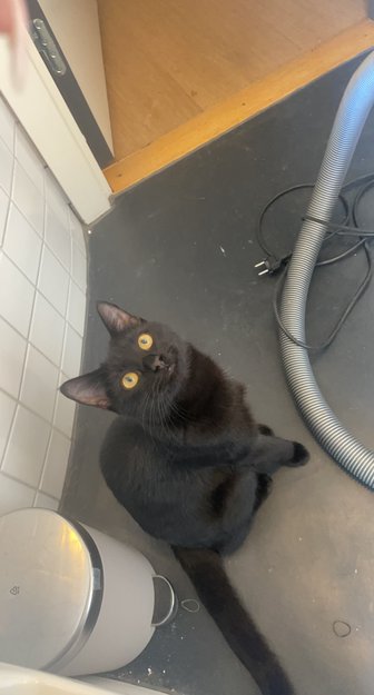 She is black with dark brown lines ,she has some white hairs on the chest and a small spot on one ear. She’s very cuddly and curious.