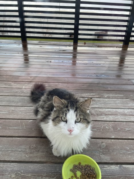 Langhåret hannkatt har vært utenfor huset vårt en stund. Ser mager ut og ikke tatt vare på. Vi har sjekket for chip, men ikke funnet. Første gang vi så den hadde den et brunt halsbånd