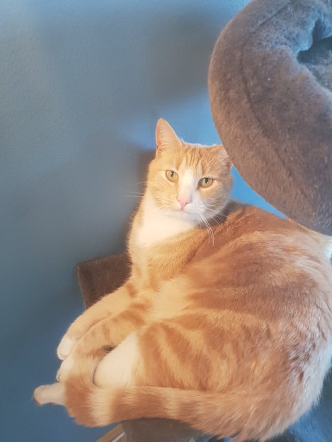 Rødbrun og hvit pels. Stor (nesten 7 kilo når han forsvant)matglad pus.