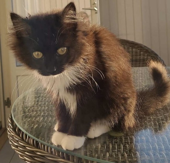 Svart semilanghåret ungkatt med hvite "sokker" på potene.