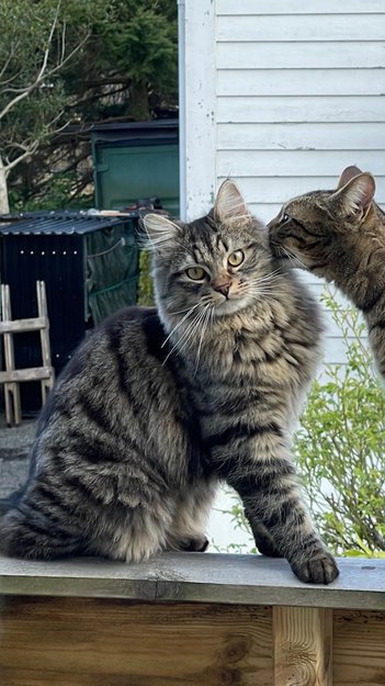 Grå og svart spraglete. Svart snute, bustete hale, lys farge på mage