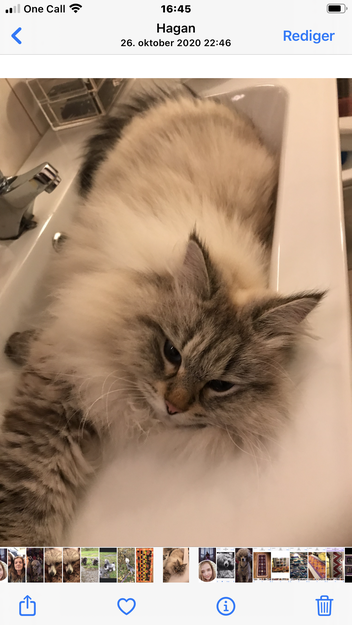 Hvit semi langhår. Blå øyne. Sky for fremmede. Brune/beige striper på ben. Kraftig lang mørk hale, Brune poter.