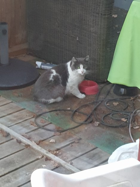 den har begynt å komme hit hver dag, til alle døgnets tider, og nå får den vann og mat hos meg. den er sky. så jeg har ikke fått kontrollert chip osv. men den blir fanget inn og tatt vare på innen 2 uker. denne pusen har så spesielle tegninger at den er lett å kjenne igjen