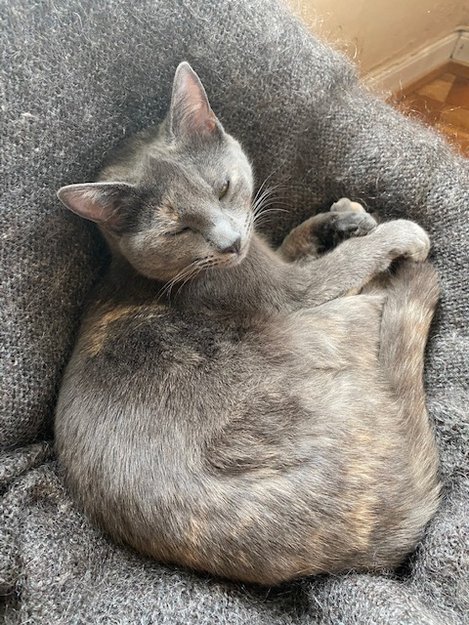 Pus er to år, sterilisert og ID-chippet. Hun er spraglete med en liten hvit flekk på brystet. slank og kontaktsøkende, men ikke så glad i å bli løftet.