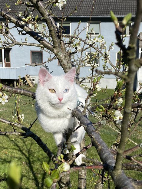 Har to forskjellige øyne. Hun er døv. Mjauer høyt