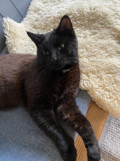 Liten hvit flekk på brystet. Lodden pels, ikke langhåret men ikke helt kort heller.