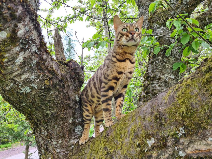 Stor (6,2 kg) og lang, brun og beige leopard mønster, grønne øyne.
