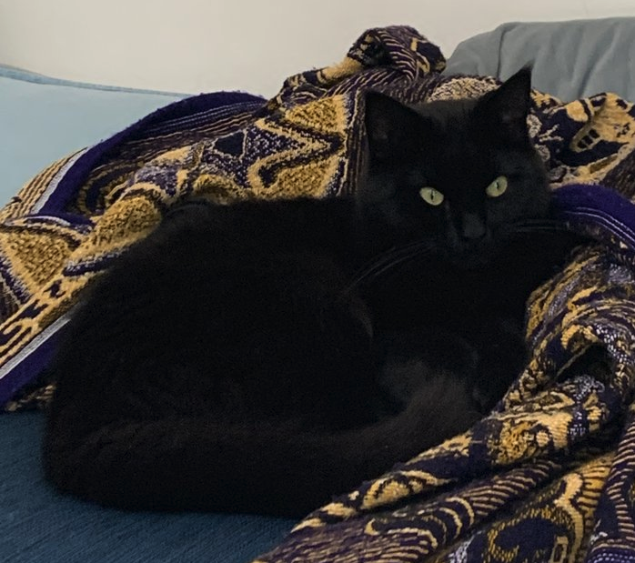 Helt svart hannkatt med medium-lang pels. 3 år gammel. Chippet og kastrert. Ganske sjenert og lett skremt av ukjent mennesker og høye lyder.