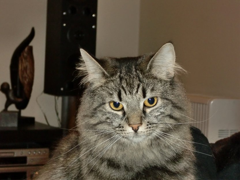 Kahlua er grå med sorte striper. Hun er noe tykk siden hun har vært innekatt tidligere og har en manke i skulderpartiet med fint grått hår som står litt ut.