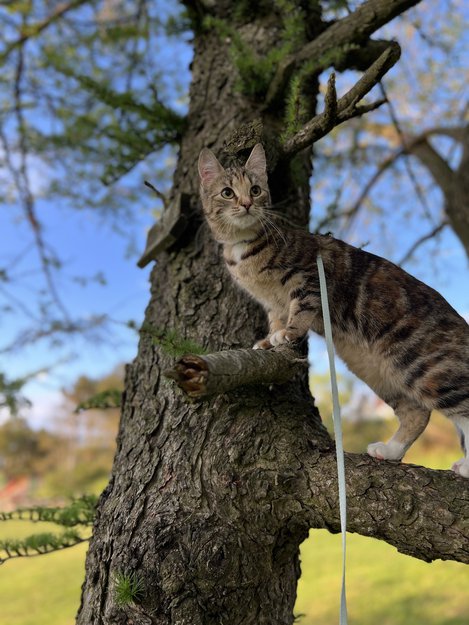 Tigerstripet tricolor hunnkatt, hvit helt nederst på frembena, lys under magen. Lilla haldsbånd, mulig hun har fått det a .