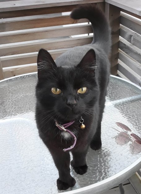 Har på seg et lilla halsbånd, med en liten bjelle på.