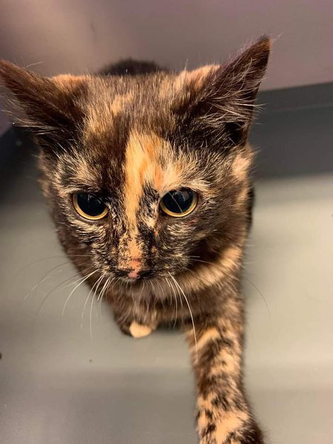 En av flere katter fra en koloni på Nesset/Frøya. Blir nå ivaretatt av Dyrebeskyttelsen sør-Trøndelag og har fått navnet Fiola.