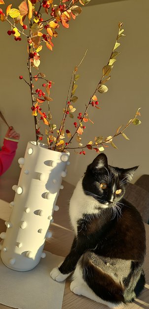 Svart og hvit hunnkatt. Begge bakre føttene er hvite. Kjempe søt og kosete rett og slett