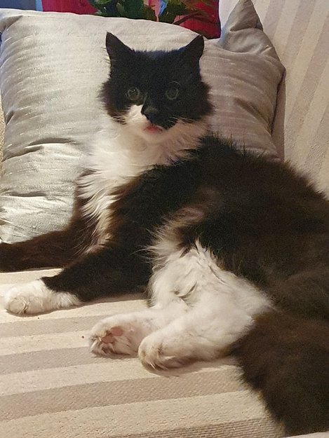 En liten eldre hannkatt med litt hvitt ytterst på halen. ( ser større ut enn han er) pratsom og selskaplig av seg.