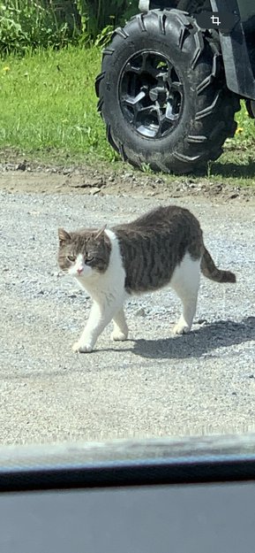 Hvit med tigerstriper på rygg og ansikt. Stor og kraftig.
