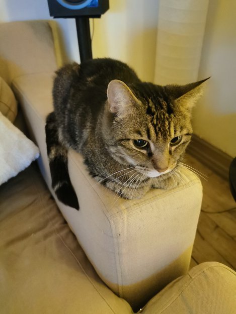 Snill og nokså skvetten innekatt. Sortstripet pels, store grønne øyne og lange hvite værhår.