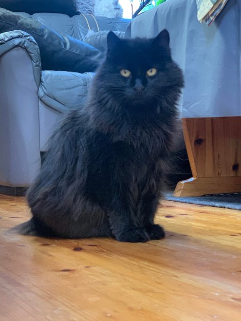 Det er en ca 6 år hunnkatt med lang, svart litt grov pels og gule øyne. Hun er kastrert og chippet.