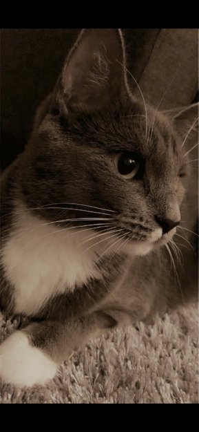Alle 4 potene er delvis hvite, magen og opp til haken er også hvit. Hun har også en hvit flekk på høyre siden av overleppen, rett ved værhårene.