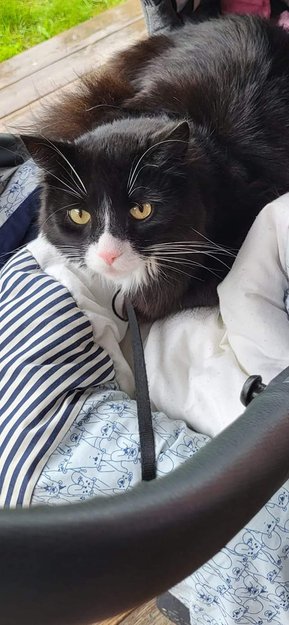 Løpet ut av huset. Er innekatt. Pleier å være på tarrasen på et bånd. Hadde svart harness på da han har forsvunnet.