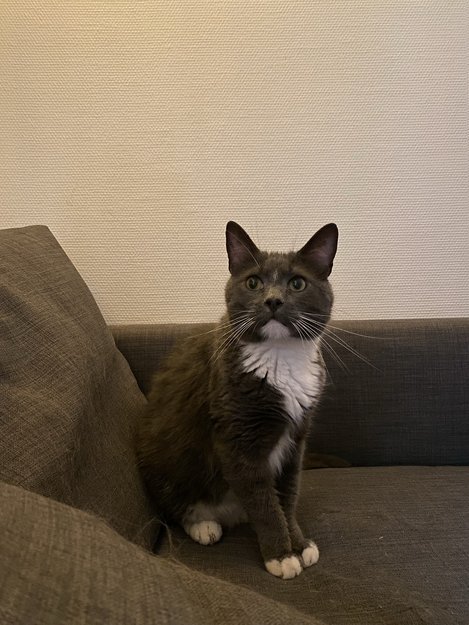 Grå pus med hvitt på mave og poter, svart nese. Har Chip :)