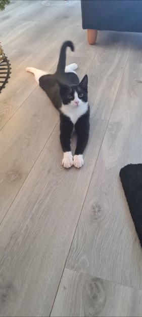 Ser ut som hun har på hvit shorts på bakbena, da hun er svart og hvit. Potene på forbena er hvite. Hva er hvit og svart i ansiktet.