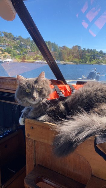 ID merket i øret og blått halsbånd med navn og tlf. Nummer på.