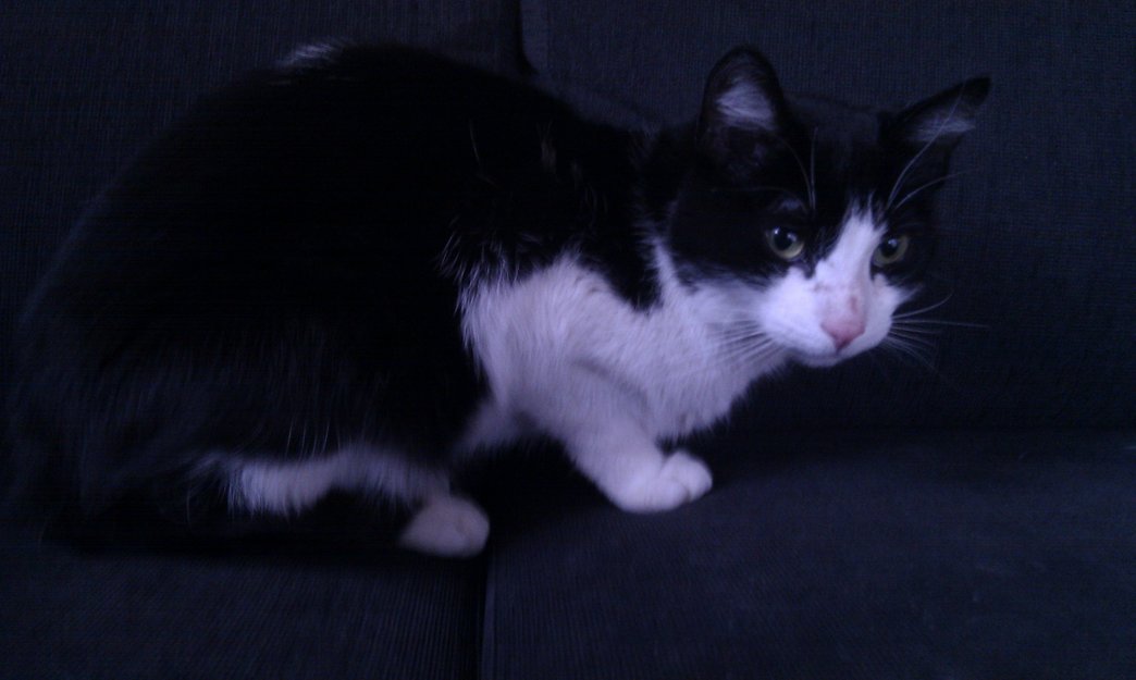 Svart og hvit katt med en kort liten svart hale.Svart på ryggen,hvit under og på føttene.Noen hvite flekker på ryggen.En veldig kosete katt som helst vil ligge å kose i fanget dagen lang!
