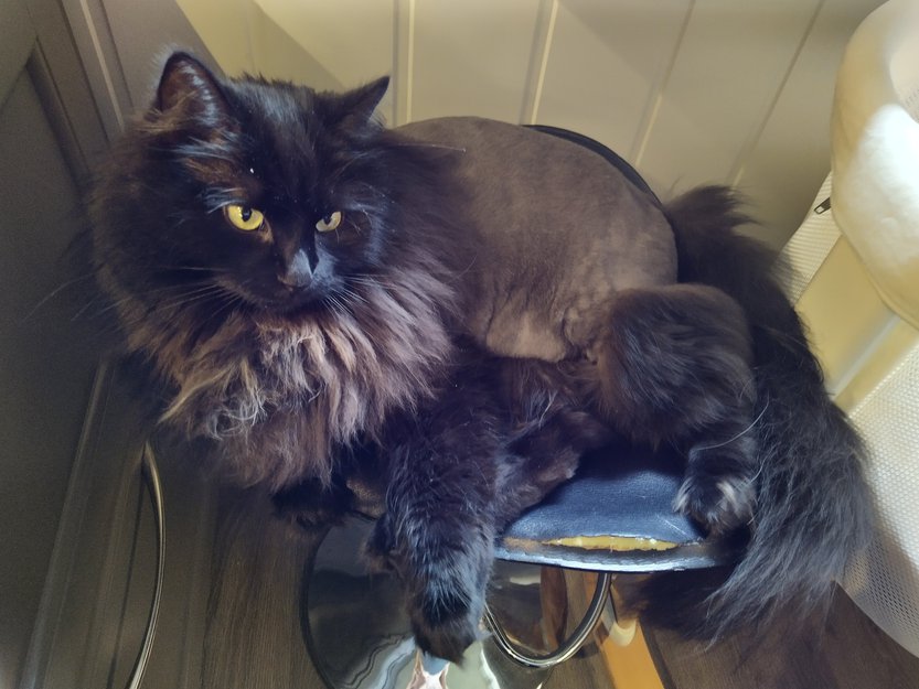 Bildet er fra i fjor, så han er sort med grå pels der han har fått løveklipp, så hode, labber og hale er sort. Har fin og lang hale med noe av pelsen som er ekstra lang. Kastrert og chippet. Grønn tatovering i det ene øret.