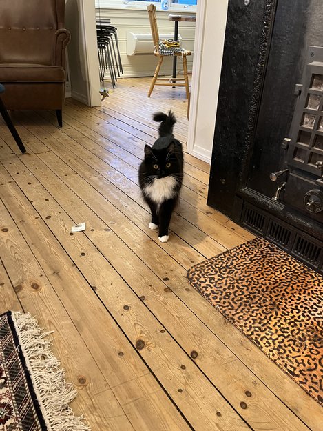 Svart og hvit «tuxedo»-katt med lang pels. Svart snute. Litt mage som henger ned. Pelsen på siden av magen og bak på potene er buskete og grålig.