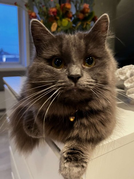 Hekt grå langhåret liten lett hunnkatt, med gule øyne. Og et gult halsbånd med bjelle på.