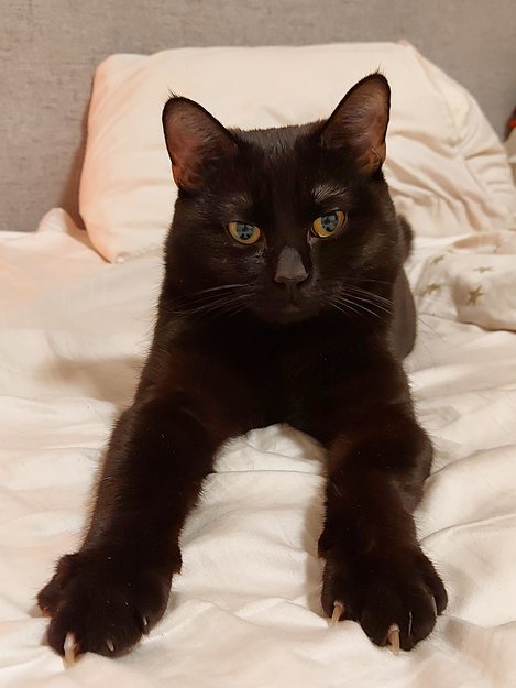 Hermann er slank og helfarget sort uten noen flekker av annen farge.