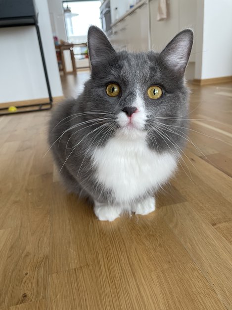Stark er langhåret grå med hvitt bryst og hvit rundt snuten. Veldig nysgjerrig og kontaktsøkende.