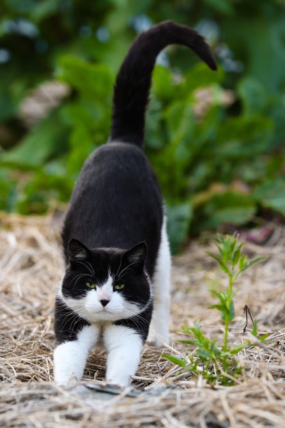 Veldig typisk utseende på katten, med sort og hvitt mønster: Men, han er hvit i ansikt, under hele magen og på beina. Samt at det fortsetter litt hvitt opp på ryggen bak hodet.