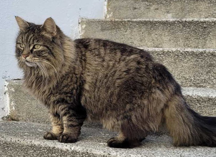 Monsen er brun/svart spraglete skogskatt. Han har et hakk i høyre øre, litt av huden er borte.