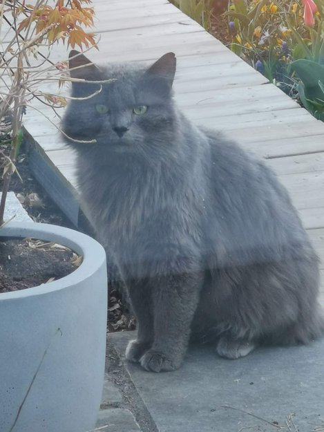 Noen som drar kjensel på den? Langhåret, mørkegrå, gul/grønne øyne. Vennlig, men ganske sky.