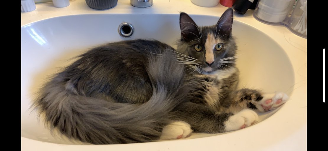 Sofie er dypt savnet (blanda rasekatt). Utrolig kontaktsøkende og ekstremt kosen. Pleier ikke å være på tur mer enn 2-3 timer før hun viser seg rundt huset. Når hun ser andre mennesker pleier hun å mjaue og søker kontakt og ELSKER også å kose med ukjente.