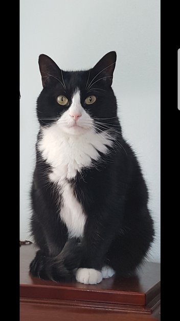 Katten min stor, korthåret, han er ganske redd og stille. Pleier å hjemme seg og er ganske rolig. Han er tofarget svart og hvit. Han er innekatt. Derfor kjenner han ikke område.