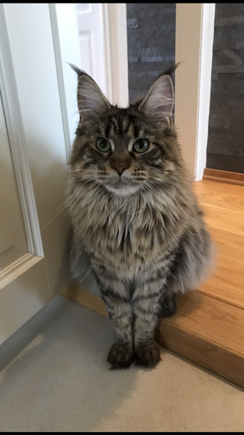 Katten er av rasen Main Coon og er derfor en ganske stor katt med « gaupeører» og stor hale. Den er gråspraglete .