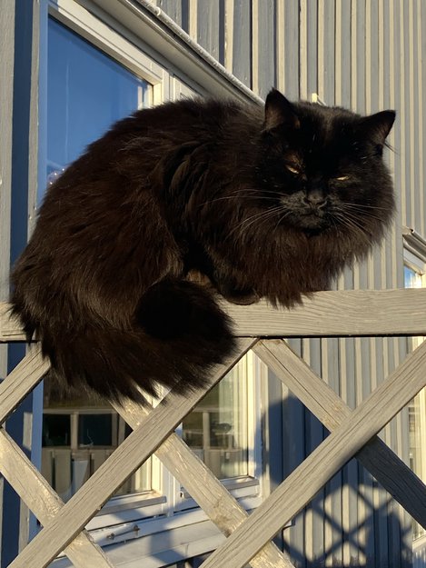 Svart, kan se litt brunlig ut i sola, langhåret. Voksen (ca.9år), men Ikke en veldig stor katt, men mye pels. Noen floker i pelsen, kanskje mange nå etter to uker ute. Knekt fortann. Kastrert og chippet, men ikke merke i øret eller andre steder.Veldig kosete. Lager distinkte «snakkelyder» her hjemme, når han vil si hei eller ha noe.