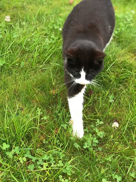 Svartvit tamkatt. Kom in på vårat hotellrum och sov hos oss under natten. Ville ha mat på morgonen så vi åkte och köpte kattmat. Utsvulten. Höll till kring hotellet.