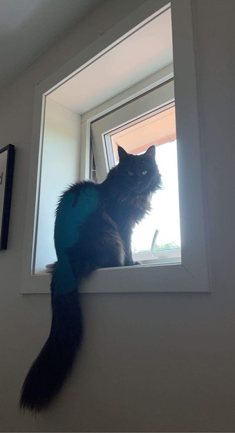Svart langhåret Main Coon innekatt. Kan frese på mennesker hun ikke er godt kjent med.